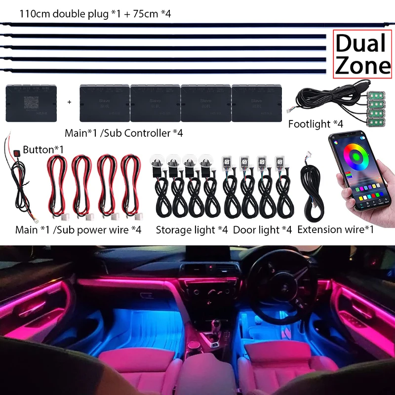 18 in 1 Dual Zone Symphony LED Car Ambient Lights RGB 64 Colors Interior Rainbow Acrylic Strip Neon Atmosphere Lighting Kit App