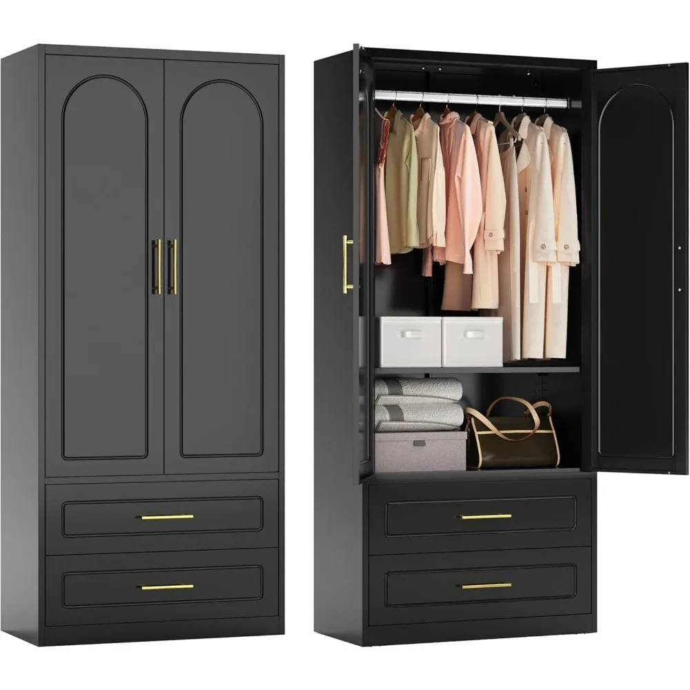 Metal Armoire Wardrobe Closet with Two Drawers, 71" Tall Large Wardrobe Cabinet with Hanging Rod, Clothing Storage Cabinet