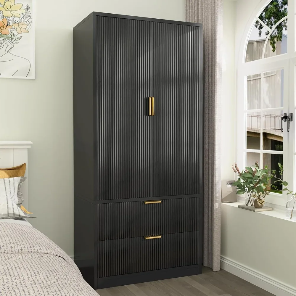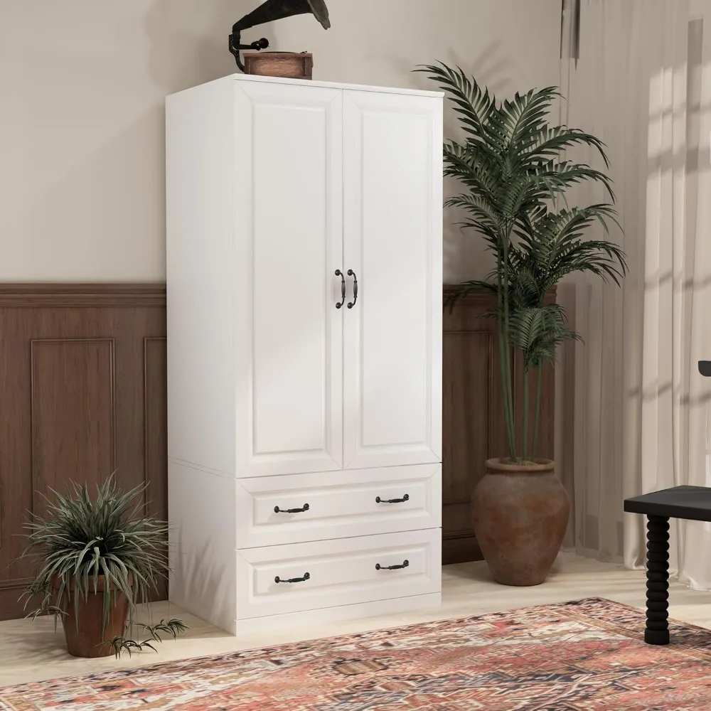 70" Wardrobe Closet with 2 Doors and 2 Drawers, Clothing Storage Cabinets with Hanging Rod, Modern Wooden Armoire Wardrobe