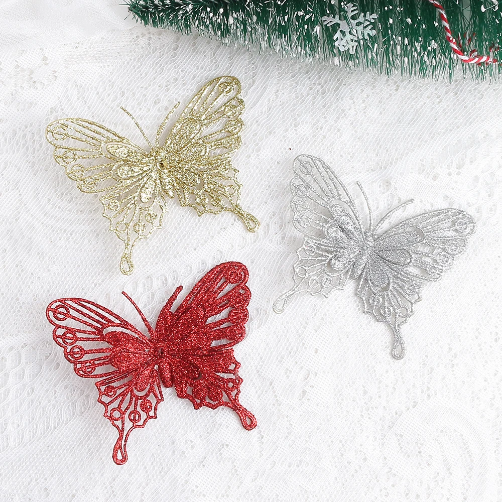 5/10PCS Christmas Butterflies Xmas Tree Ornaments Single Layer Gold Powder Glitter Artificial Flower DIY Crafts Christmas Decor  Read more