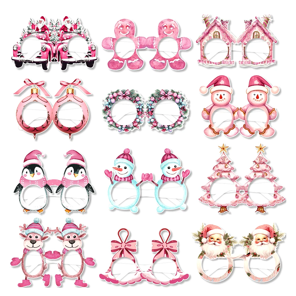 12pcs Pink Vintage Christmas Paper Glasses Santa Claus Snowman Deer Glasses Frame Xmas Party Funny Photo Props Supplies 2025