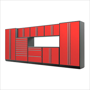 Proslat Garage Cabinets 11-Piece Glossy Red Cabinet Set with Silver Handles and Powder Coated Worktop