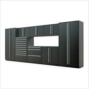 Proslat Garage Cabinets 9-Piece Mat Black Cabinet Set with Silver Handles and Stainless Steel Worktop