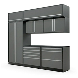 Proslat Garage Cabinets 8-Piece Glossy Grey Cabinet Set with Silver Handles and Powder Coated Worktop