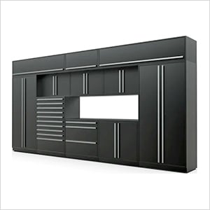 This eleven (11) piece kit with recessed and channeled worktop provides versatile oversized shelves / drawers, and space saving wall storage to get you clutter-free quickly.