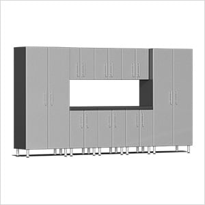 This nine (9) piece kit with recessed and channeled worktop provides versatile oversized shelves / drawers, and space saving wall storage to get you clutter-free quickly.