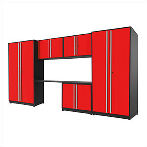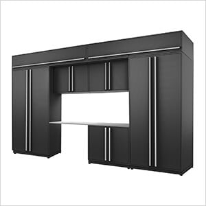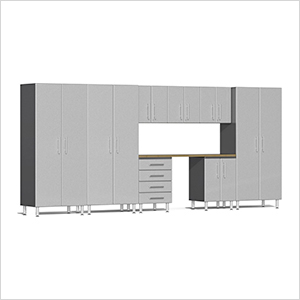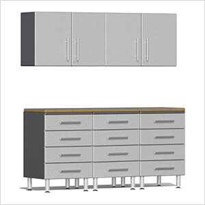 This five (5) piece garage cabinet system with bamboo worktop provides versatile oversized shelves / drawers, and space saving wall storage to get you clutter-free quickly.