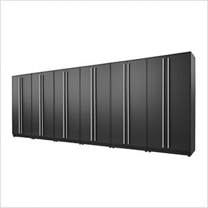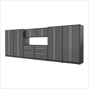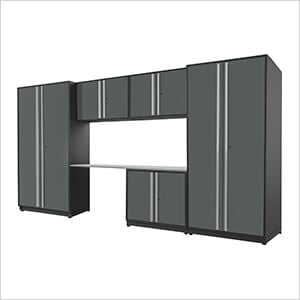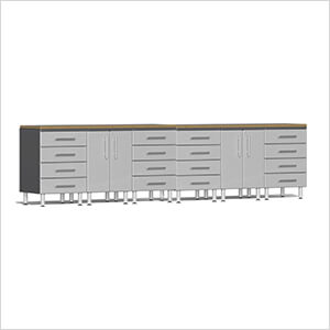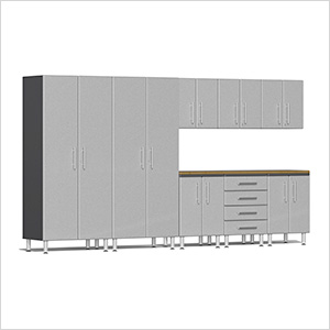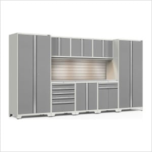This NewAge Products 9-piece garage cabinet system with bamboo worktop and silver grey door fronts is made from 18 gauge steel fully welded frames and 19 gauge double wall doors.