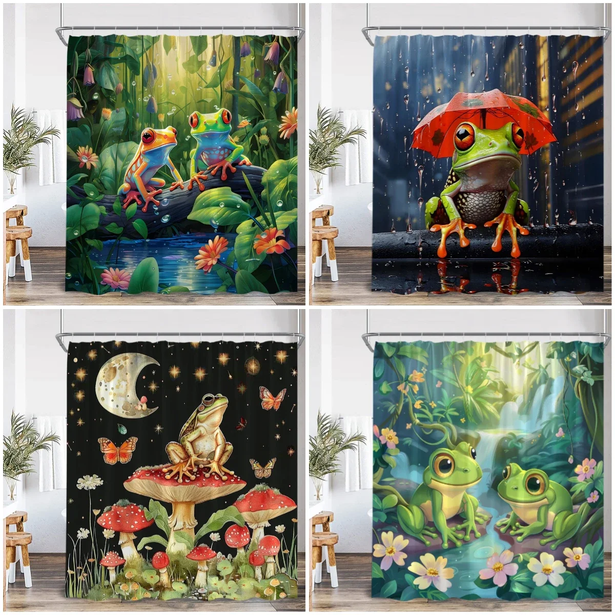 Funny Frog Shower Curtain Animal Lotus Leaf Pond Mushroom Rainforest Vintage Summer Bathroom Decor Kid Bath Curtain with Hooks