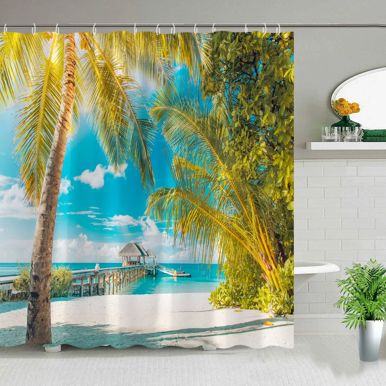 Hawaii Landscape Outdoor Shower Curtain Island Beach Coconut Tropical Ocean Natural Landscape Hanging Curtain Bathroom Decor Set