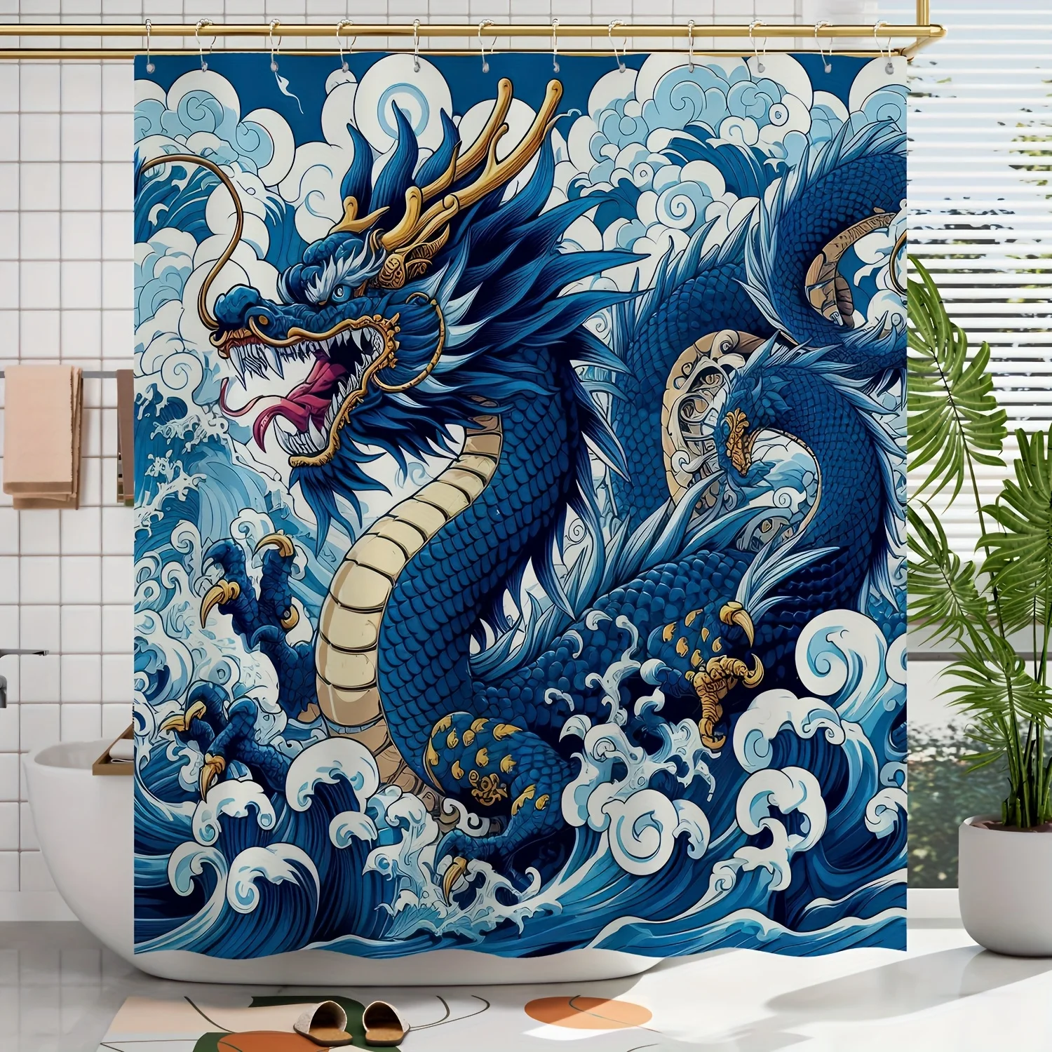 1pc Vibrant Blue Dragon & Ocean Waves Printed Shower Curtain - Washable Polyester, Includes Hooks, Artistic Bathroom Decor for