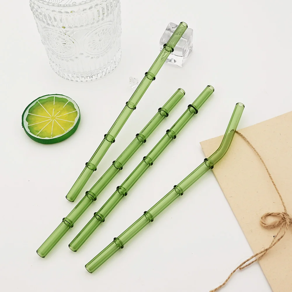 4Pcs 200*8mm Reusable Straws Glass Straws Green Bamboo Design with 1 Cleaning Brush for Smoothies Milkshakes Juices Tea