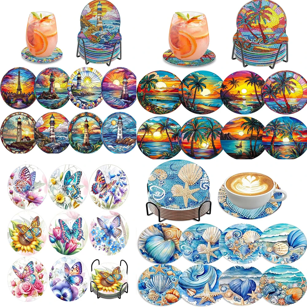 8 pieces/set DIY Diamond Painted Art Seaside Landscape Painting Coaster with Bracket Kit, Beverage Insulation Diamond Coaster Su