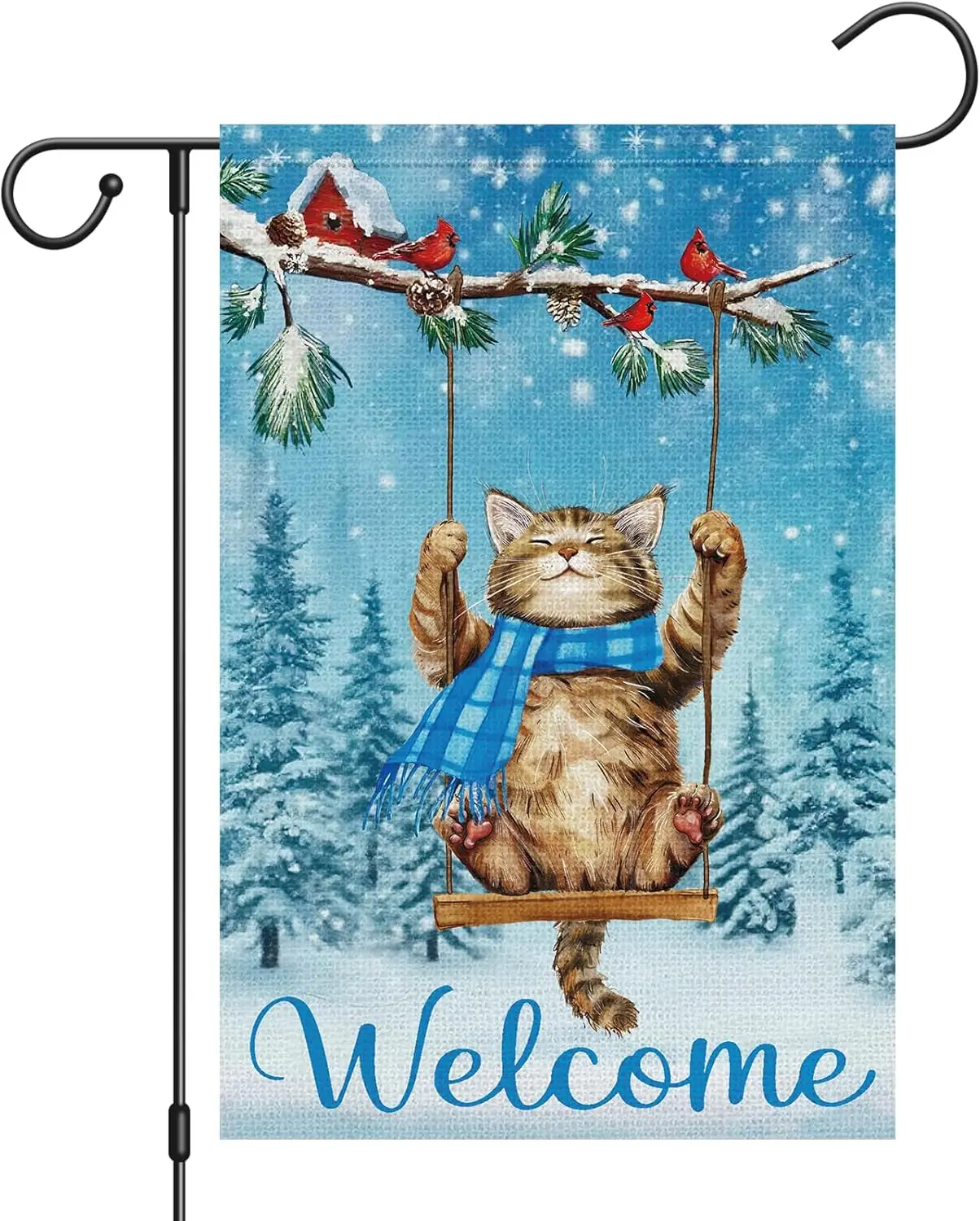 Heyfibro Winter Cute Cat Welcome Garden Flag 12x18 Inch Double Sided Burlap, Christmas Cardinal Snowflake Yard Flags for Sea DDN