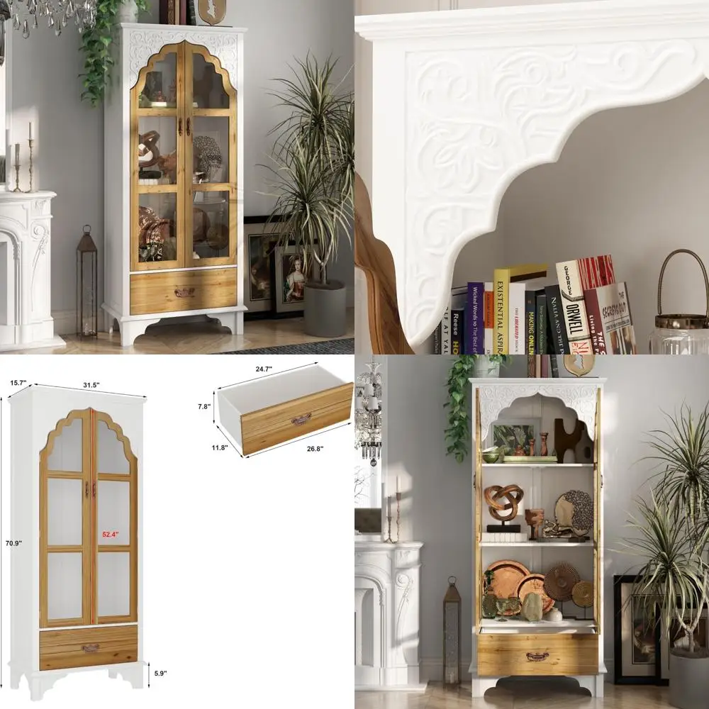 Farmhouse Style Corner Kitchen Pantry Cabinet with 3 Shelves, Drawer, Carved Glass Doors, and Storage Display Features