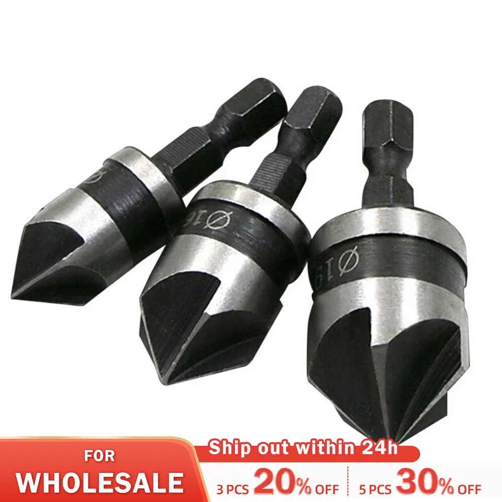 3PC Hexagonal Shank 90 Degree Black Five Blade Chamferer 12/16/19mm Countersink Drill Woodworking Hole Opener Tool Set