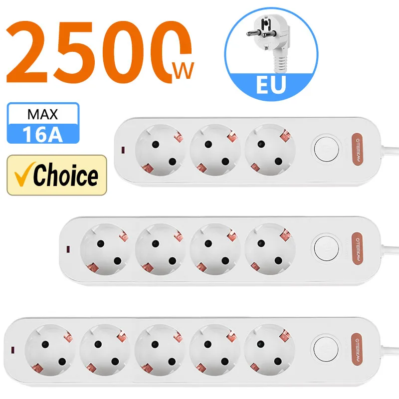 Power Strip EU Plug 3/4/5 Way Outlets Electrical Extension 2m Cord 16A Sockets Independent Control Switches for Home Office