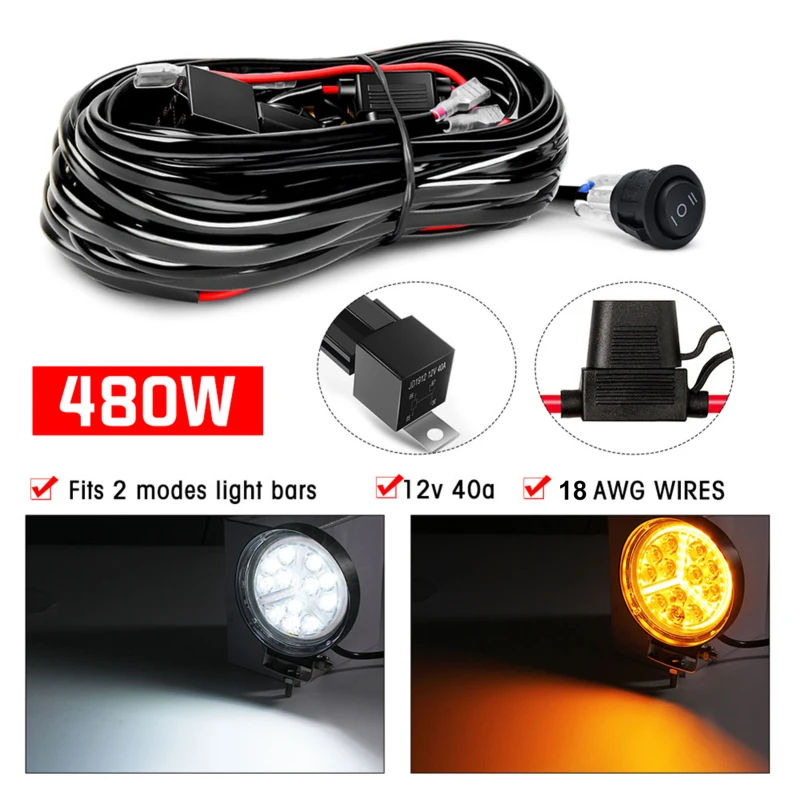 LED Light Bar Wiring Harness Kit 480W 2 Leads 18 AWG LED Wiring Harness with 12V 40A Relay and Waterproof Control Switch