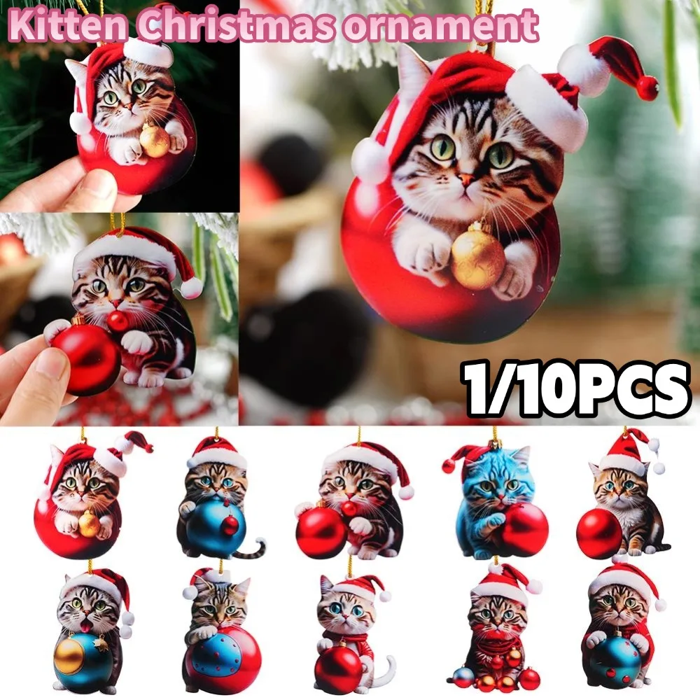 1/10pcs Cute 2D Acrylic Kitten Christmas Ornament With Santa Hat Cat Auto Hanging Decor For Home Xmas Tree Car Accessories Gift