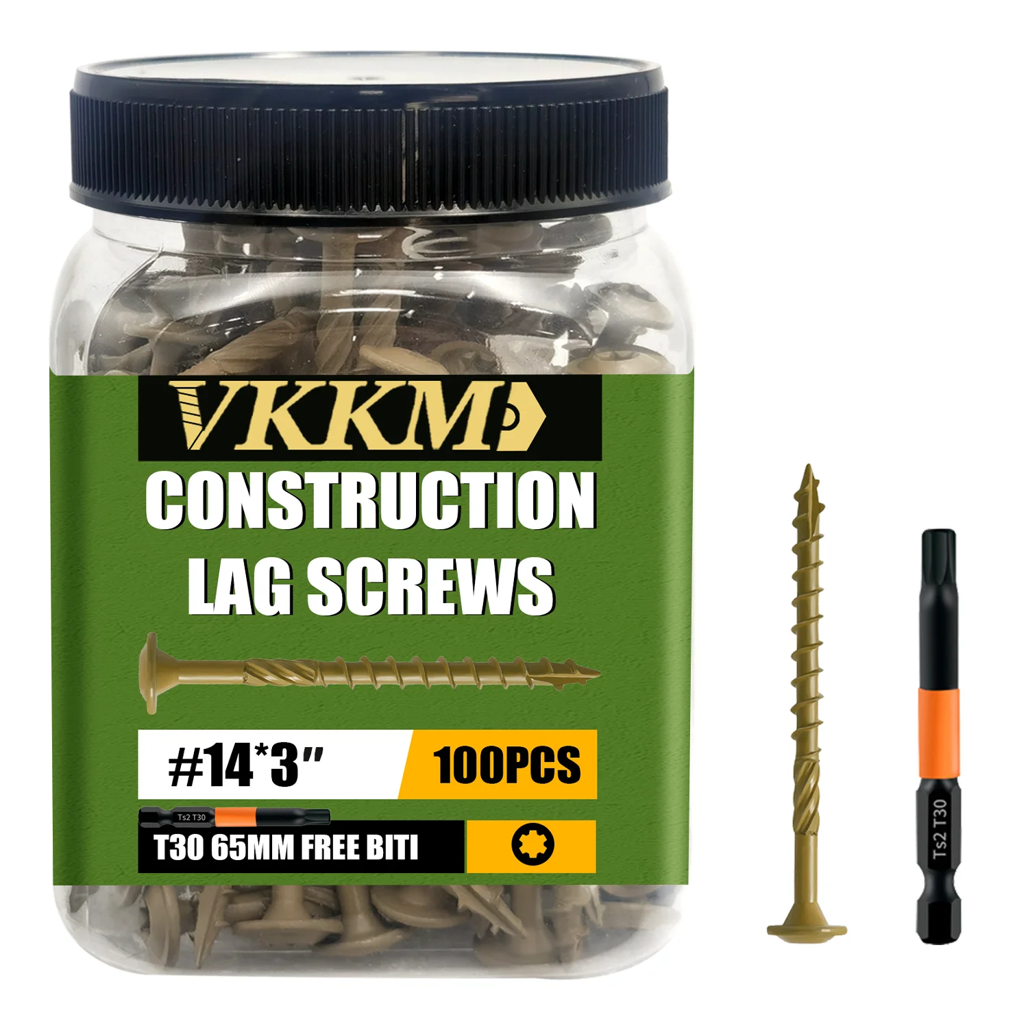 VKKM 100PCS 14x3" Heavy Duty Wood Screws - Yellow Zinc Coated Carbon Steel w/ T30 Bit | Construction Grade