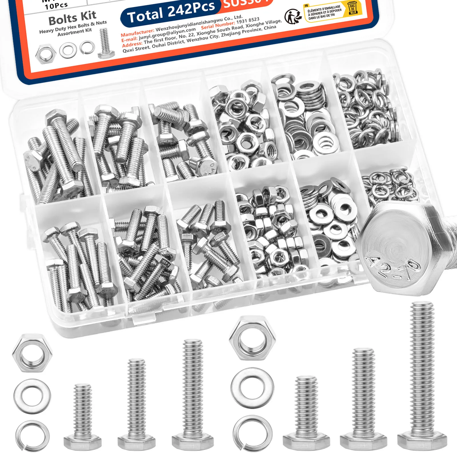 242pcs Stainless Steel Hex Head Nuts and Bolts Assortment Kit M4 M5 Sizes with Flat & Spring Lock Washers in Storage Case