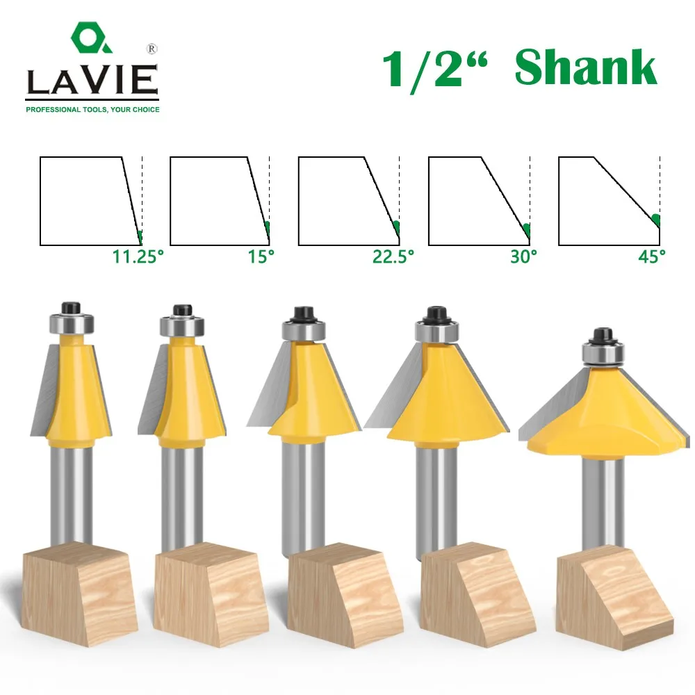 LAVIE 1pc 1/2" Shank 11.25 15 22.5 30 45 Degree Chamfer & Bevel Edging Router Bit Two Flute Woodworking Milling Cutting Bits