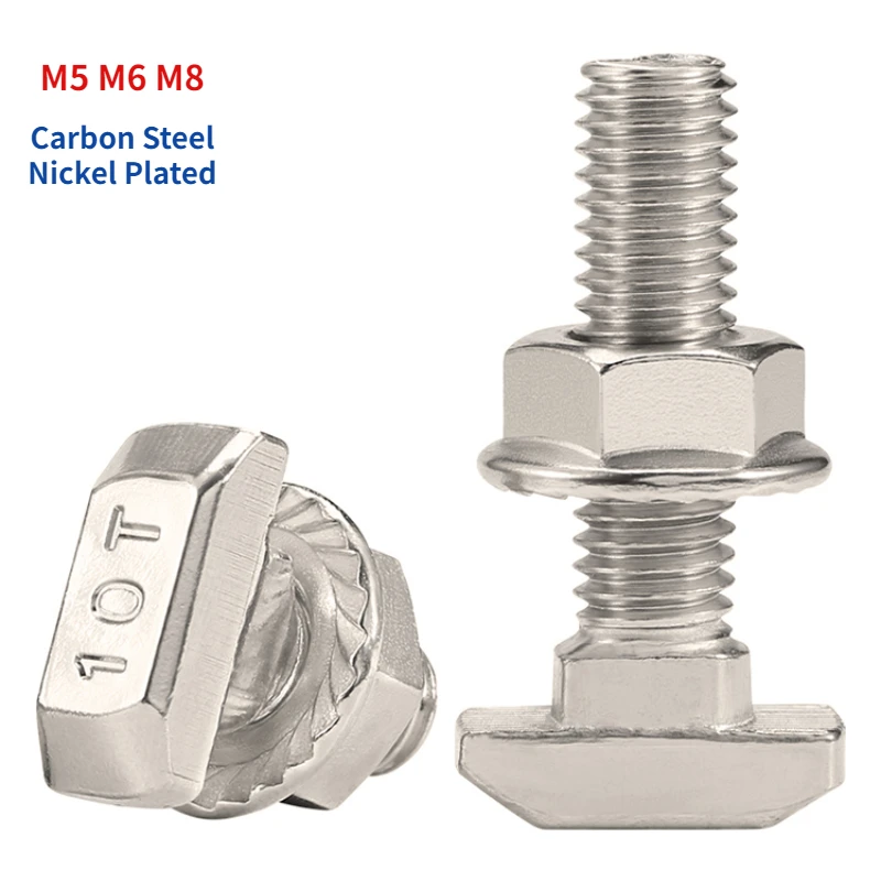 M5 M6 M8 T Bolt Screw and Hexagon Flange Nuts Nickel Plated for 20/30/40/45 Series European Standard T-Slot Aluminum Profile