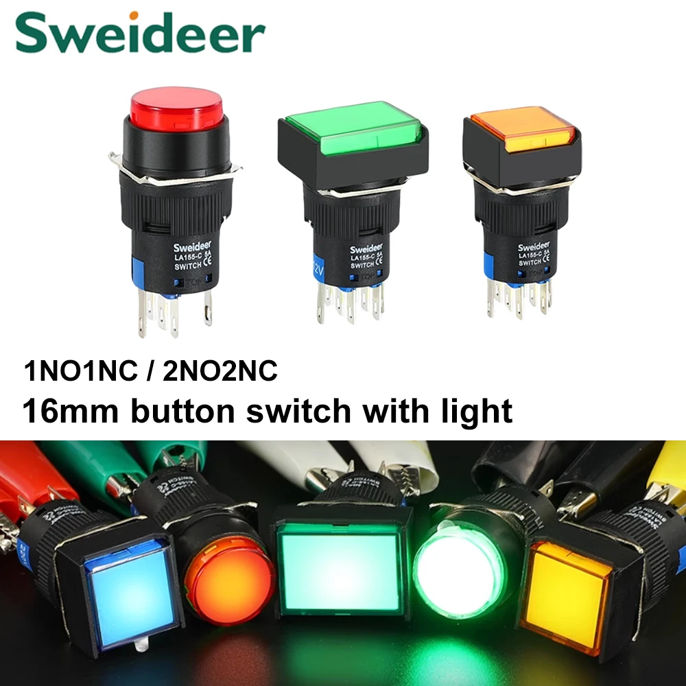 16mm Push Button Switch LED Illuminuted 12/24/220V Momentary Self-locking on Off with Light Square Round Rectangle Power Switch