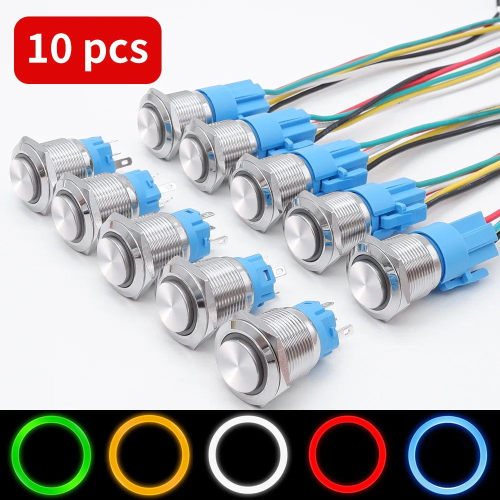 10 pcs Latching Push Button Switch Metal Shell 16/19/22mmWaterproof Power Symbol Pattern Self-Locking Momentary Fixed 1NO 1NC