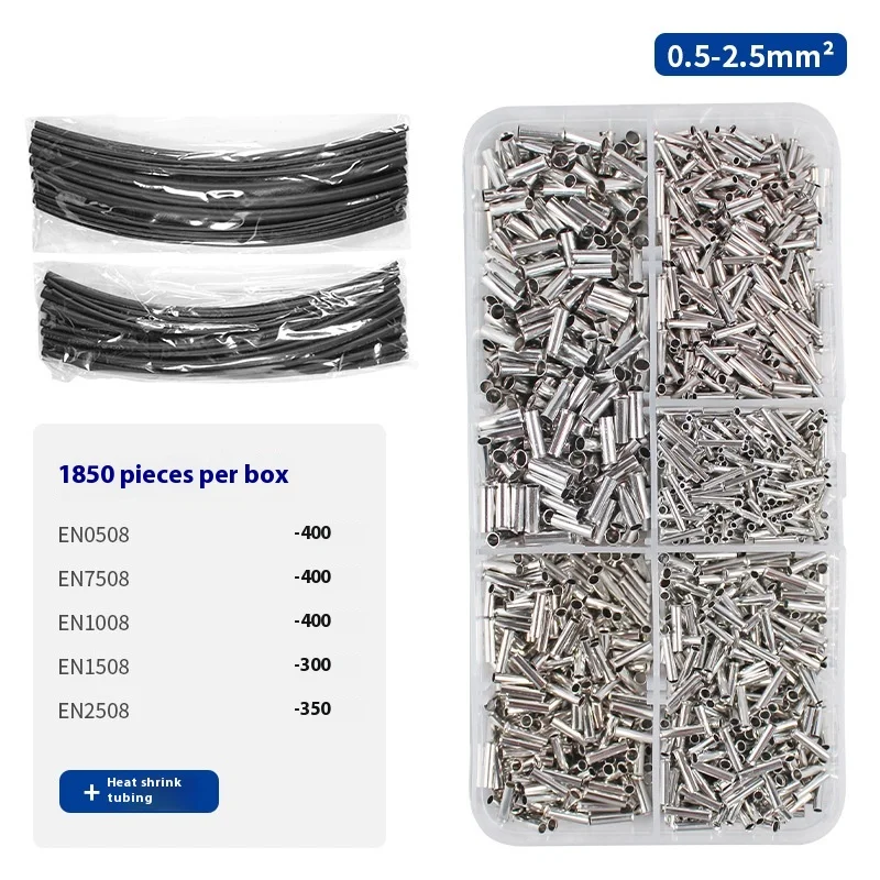 1850pcs EN Tube Type Bare Terminal Small Copper Pipe Wiring Terminal Combination Heat Shrink Tube Box