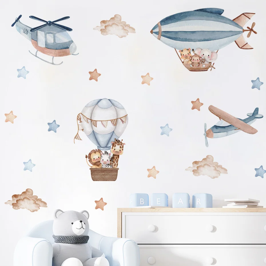 Watercolor Animals Hot Air Balloon Clouds Wall Stickers for Kids Room Baby Nursery Room Wall Decals Boy Room Stickers Wall Decal