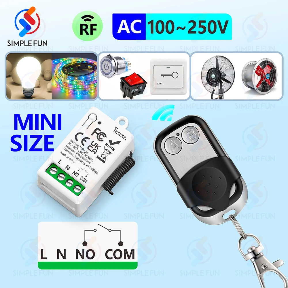 433Mhz Wireless Remote Control Switch 220V 230V 110V 1CH 10A Mini Relay Receiver Module 70m Range Transmitter for LED/Light/Fan