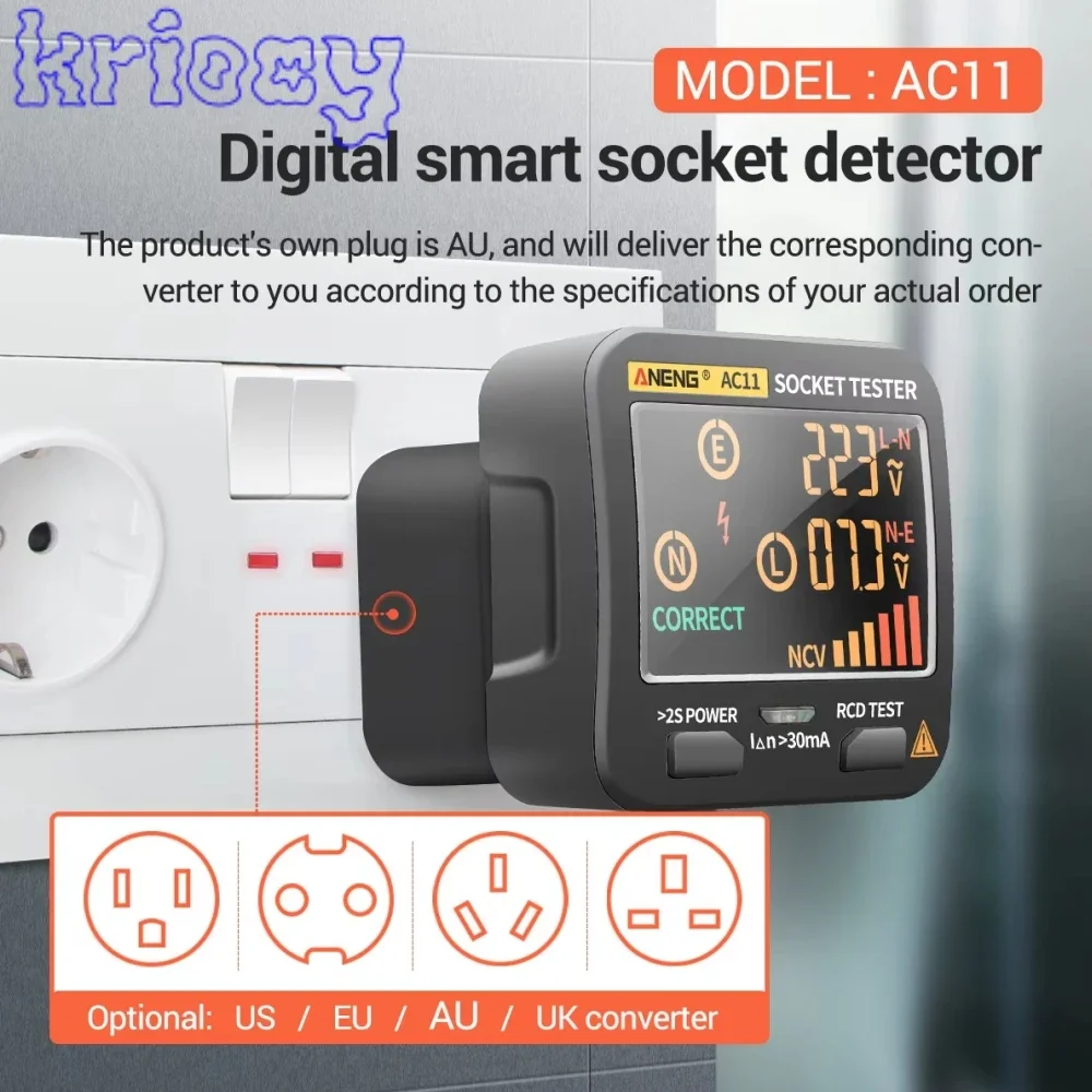 AC11 Digital Smart Socket Tester Voltage Test Socket Detector Ground Zero Line Phase Check Rcd NCV Test US/UK/EU/AU Plug