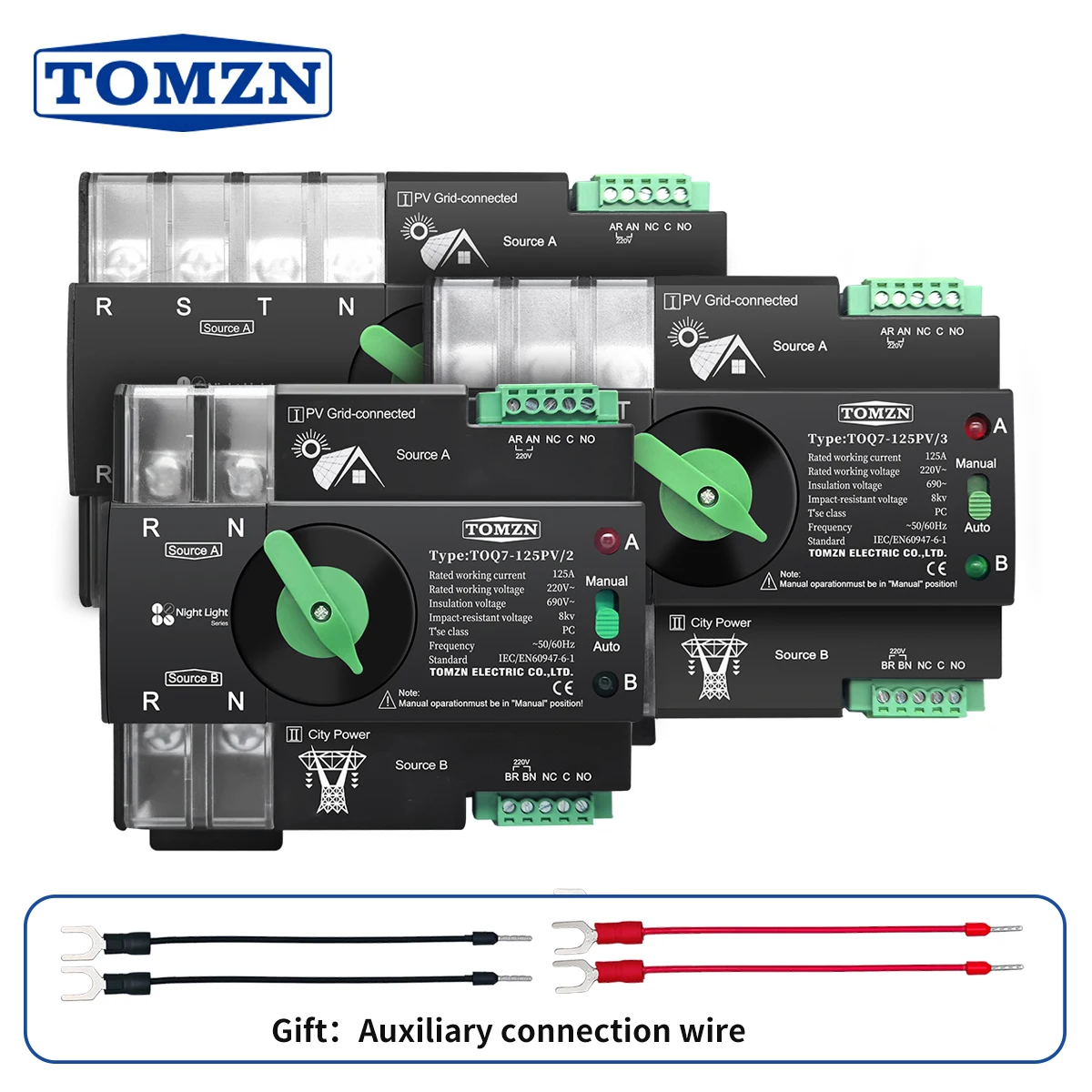 TOMZN Din Rail for PV 3 phase 2P3P4P 63A 100A 125A 230V Dual Power Automatic Transfer Electrical Selector Switch Uninterrupted