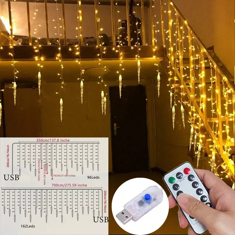 Christmas Garland USB LED Icicle Curtain String Lights Droop Garden Wedding Decorative Lighting 8-mode with Remote Control Xmas