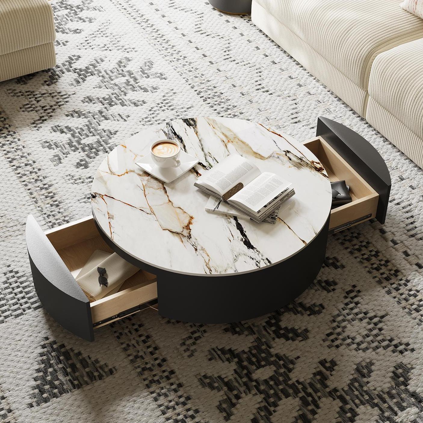 39" Round Drum Sintered Stone Coffee Table with Storage, Modern Wood Coffee Table with 2 Drawers, Fully Assembled, Black & White