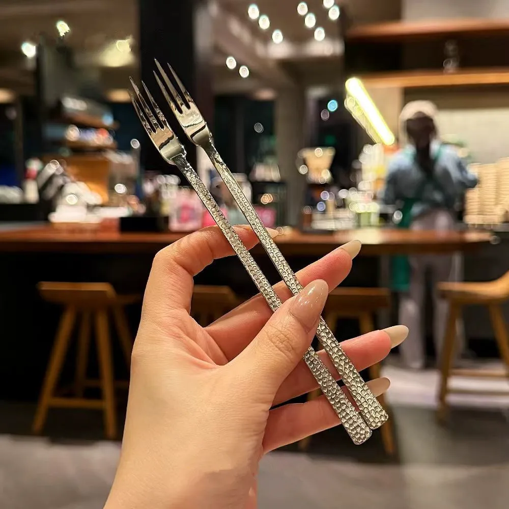 【2-Piece Set】Stainless Steel Hammered Dessert Forks Premium Steak Forks Fruit Forks, Pasta & Salad Forks Western Dining Utensils