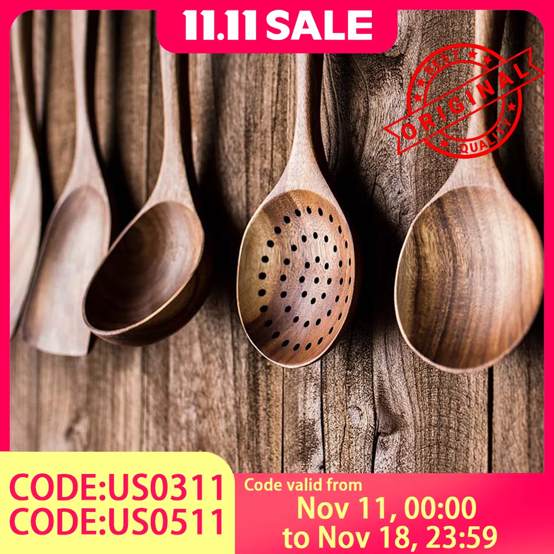 Teak Wooden Utensil Set 5-Piece - Natural Cooking Spoons, Spatula, Slotted Spoon, Salad Server, Non-Scratch Eco-Friendly Kitchen