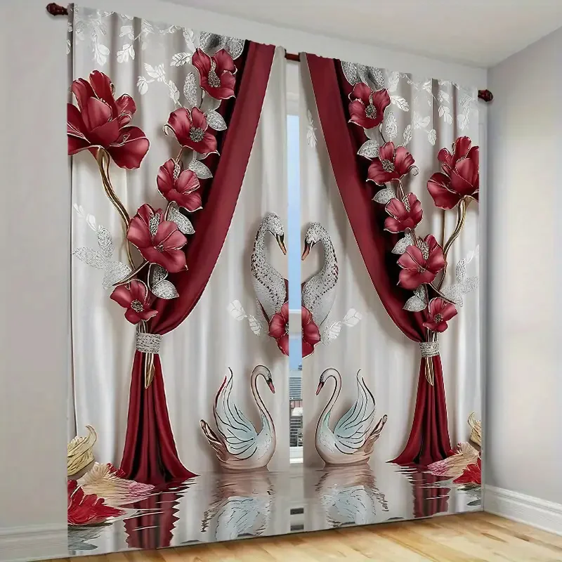Elegant swan red and white floral printed curtains, suitable for bedroom and living room home decoration