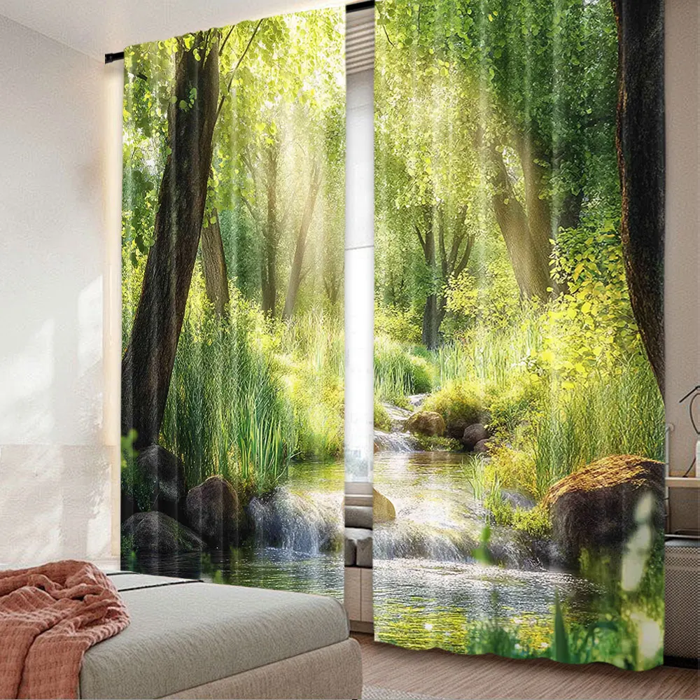 2Pcs Forest Curtain Stream Cascade In Tropical Forest Among Trees Jungle Woodland Serene Landscape Suitable For Living Room