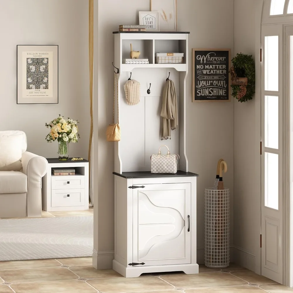 Farmhouse Narrow Coat Rack with Shoe Storage, 6 Shoe Cubbies & 4 Coat Hooks, Hall Tree with Shoe Storage, Entryway Bench
