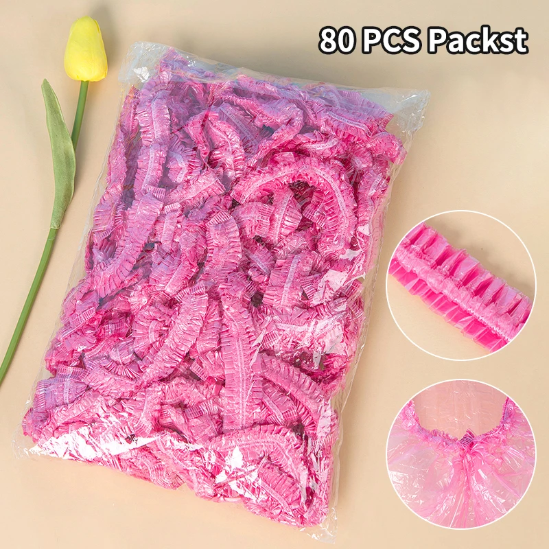 80pcs Shower Cap Head Cover Elastic Plastic Thickened Pink Round Cover Food Kitchen Bathroom Accessories Food Preservation Bag