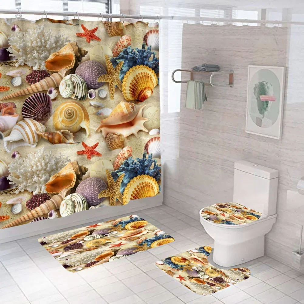 4pcs Beach Shells Shower Curtains Set Summer Waterproof Shower Curtain Anti-slip Mat Toilet Cover Set Marine Style Bathroom Deco