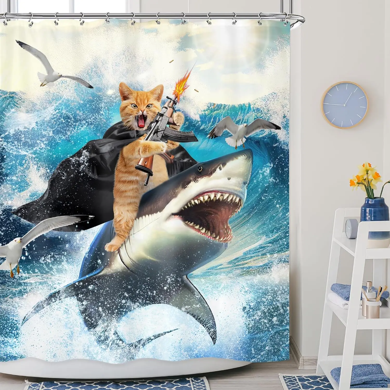Funny Cat Shower Curtain, Riding Shark Ocean Theme Hilarious Cool Fun Blue Ocean Wave Animal Nautical Whale Boys Bathroom Decor