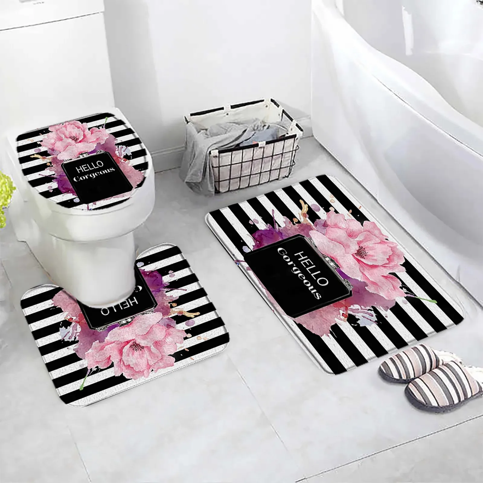 Pink Floral Perfumed Bath Mat Set Hello Gorgeous Black White Stripe Fashion Home Carpet Bathroom Decor Floor Rugs Toilet Cover