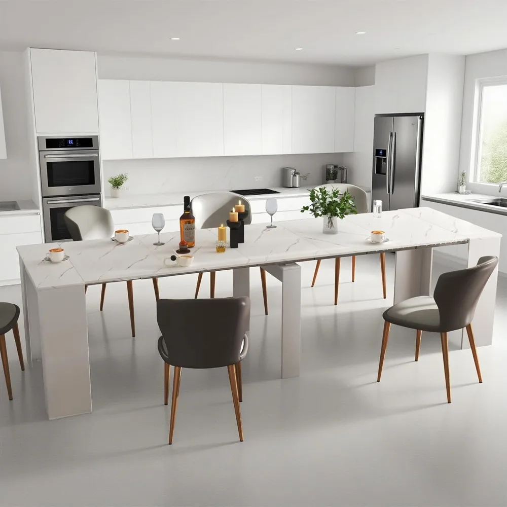 Modern 20 to 118.5 Inch Expandable Dining Table, White Marble Top, Seats 2 to 12 People