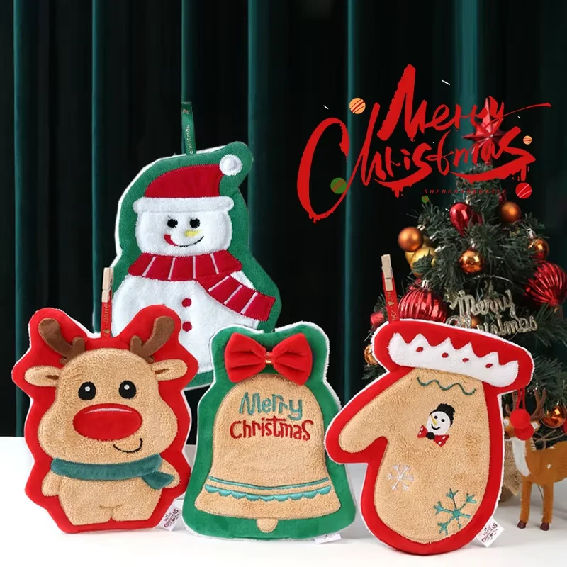Merry Christmas hand towel, thickened coral fleece cartoon cute extended rope Christmas hand towel, water-absorbent quick-drying
