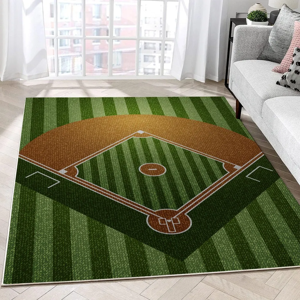 Baseball Field Carpet Mat Rug - Green Stripes Realistic Sports Theme Home Decoration for Living Room Kids Play Area Bedroom Mat