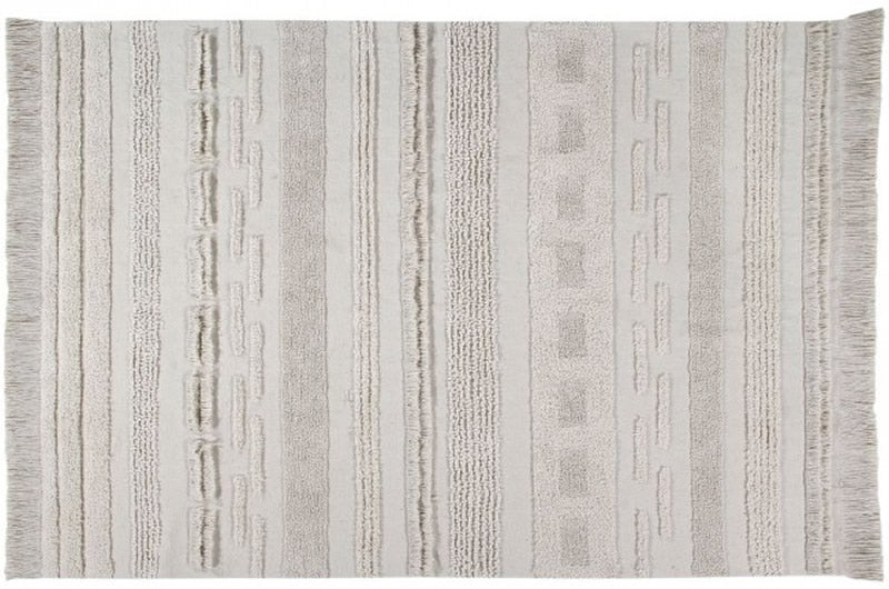 This natural cotton rug has been made in mixed Ivory, Natural and Pearl Grey yarns, forming a soft shades pattern, creates a ?mixed fibres? effects and a more realistic design. It contains cotton pompons in each corner. Being ideal for children's...