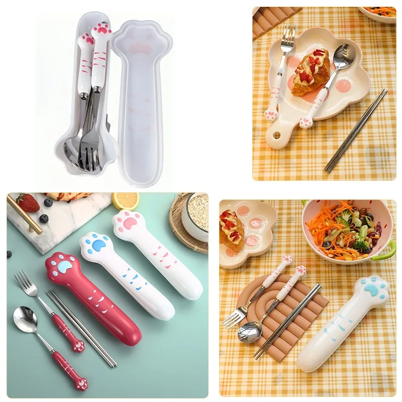 Cute Cat Paw Cutlery Set Stainless Steel Fork Spoon with Storage Box Lunch Bento Portable Creative Cartoon Cat Claw Tableware